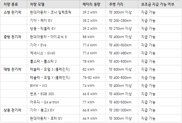 배터리 용량: 기본적으로 35kWh 이상인 차량은 보조금 지급 대상이 될 수 있습니다. 하지만 용량에 따라 지급되는 보조금 금액이 달라질 수 있습니다.
