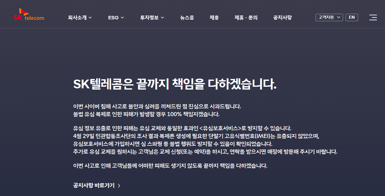 단순히 유심보호서비스와 유심 교체 안내만 포함되어 있었습니다.