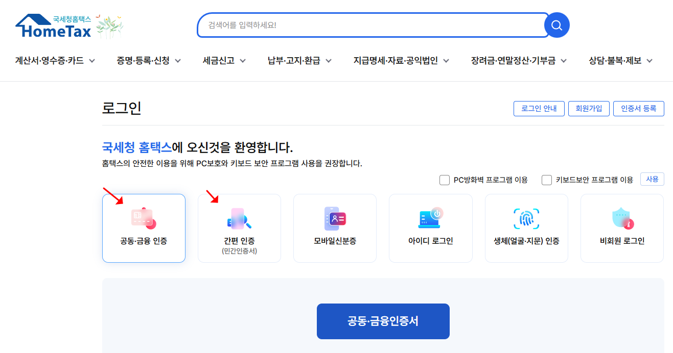 공인인증서나 간편인증으로 로그인합니다.